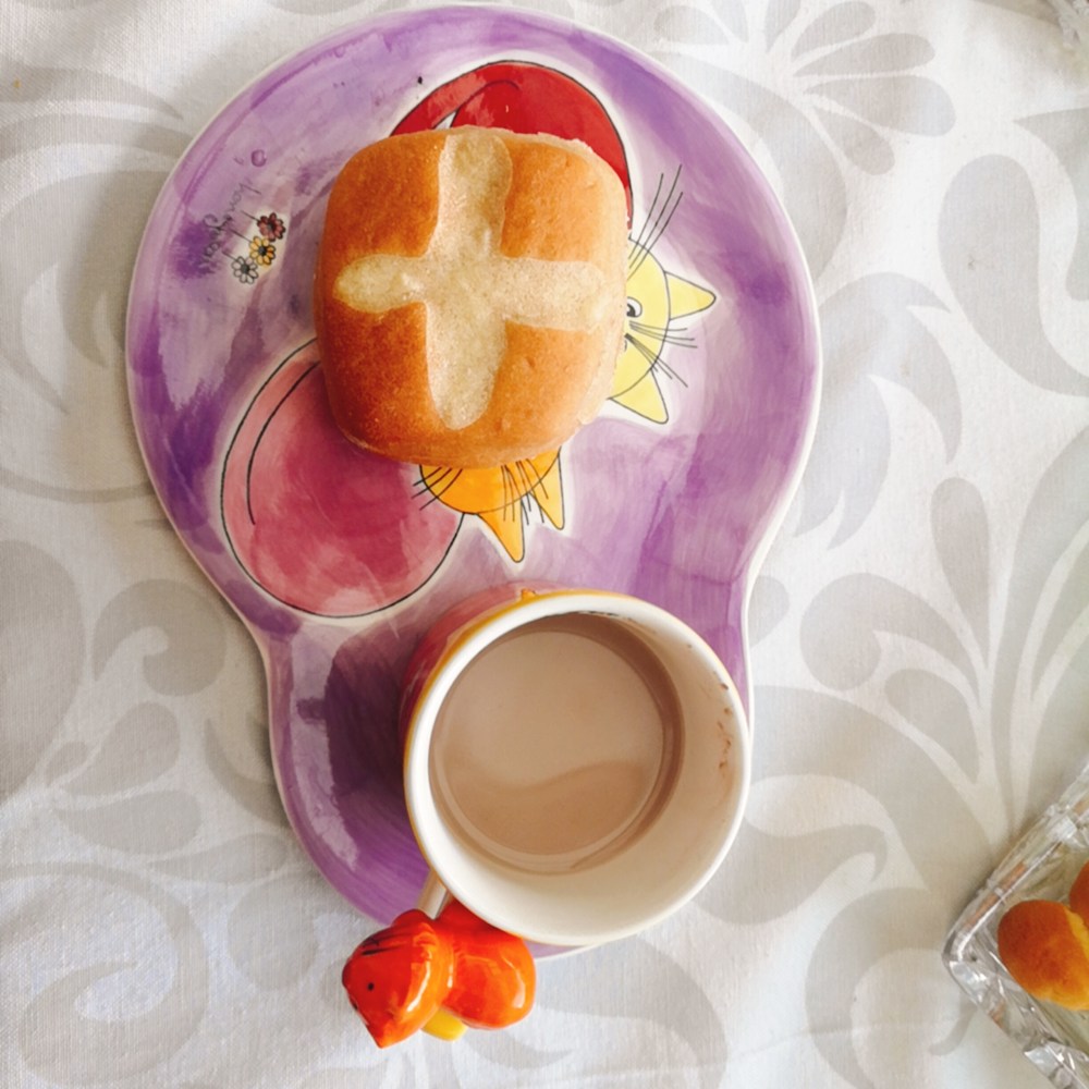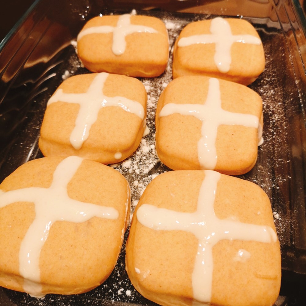 São feitos e comidos na sexta-feira Santa, ligeiramente temperados, ligeiramente doces, a versão tradicional leva uva passa (mas não coloquei) e com uma cruz no topo. Estes pães marcam o fim da Quaresma, o tempo tradicional do jejum.