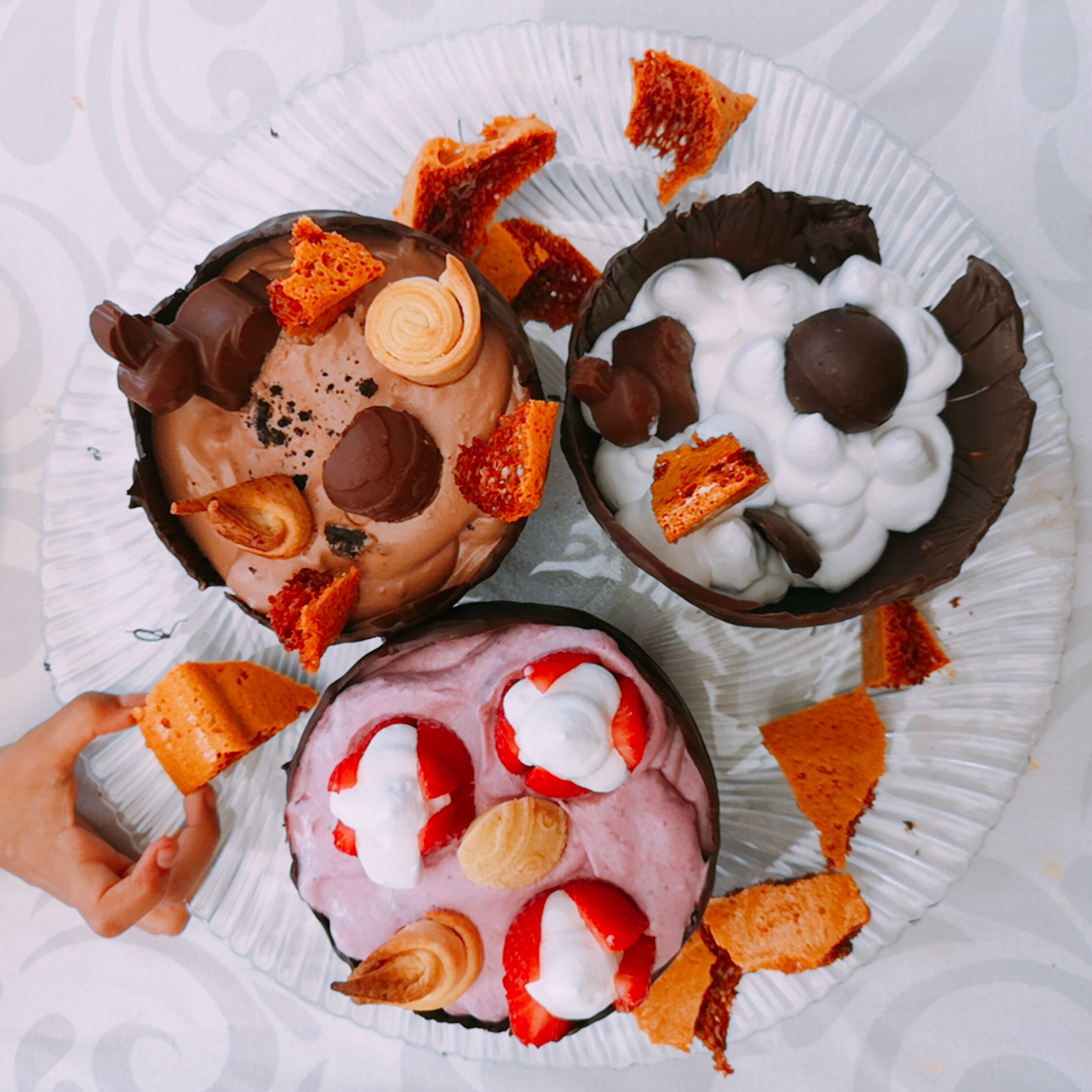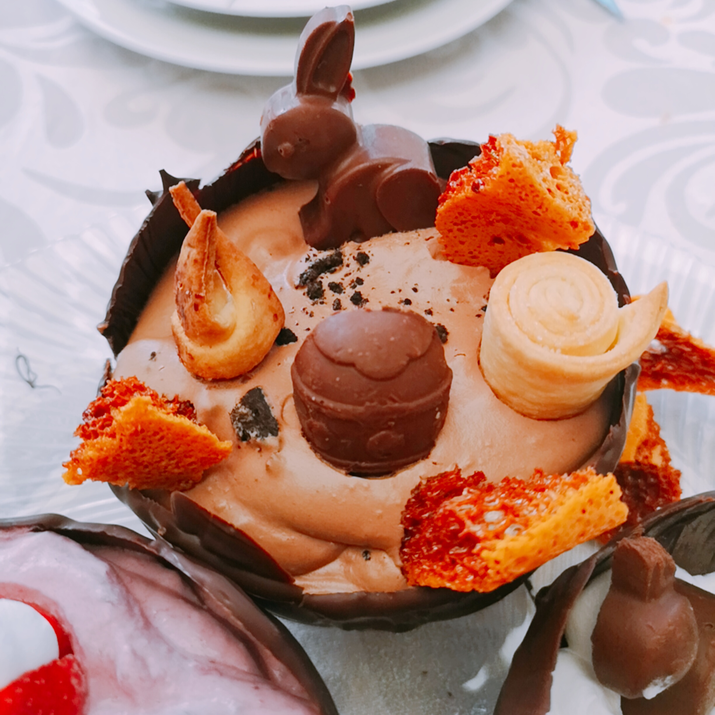 Temos uma infinidade de detalhes, mousse de chocolate & Oreo, rolos de massa quebrada, honeycomb, varios tipos de chocolate que fiz para o coelho da Pascoa esconder.