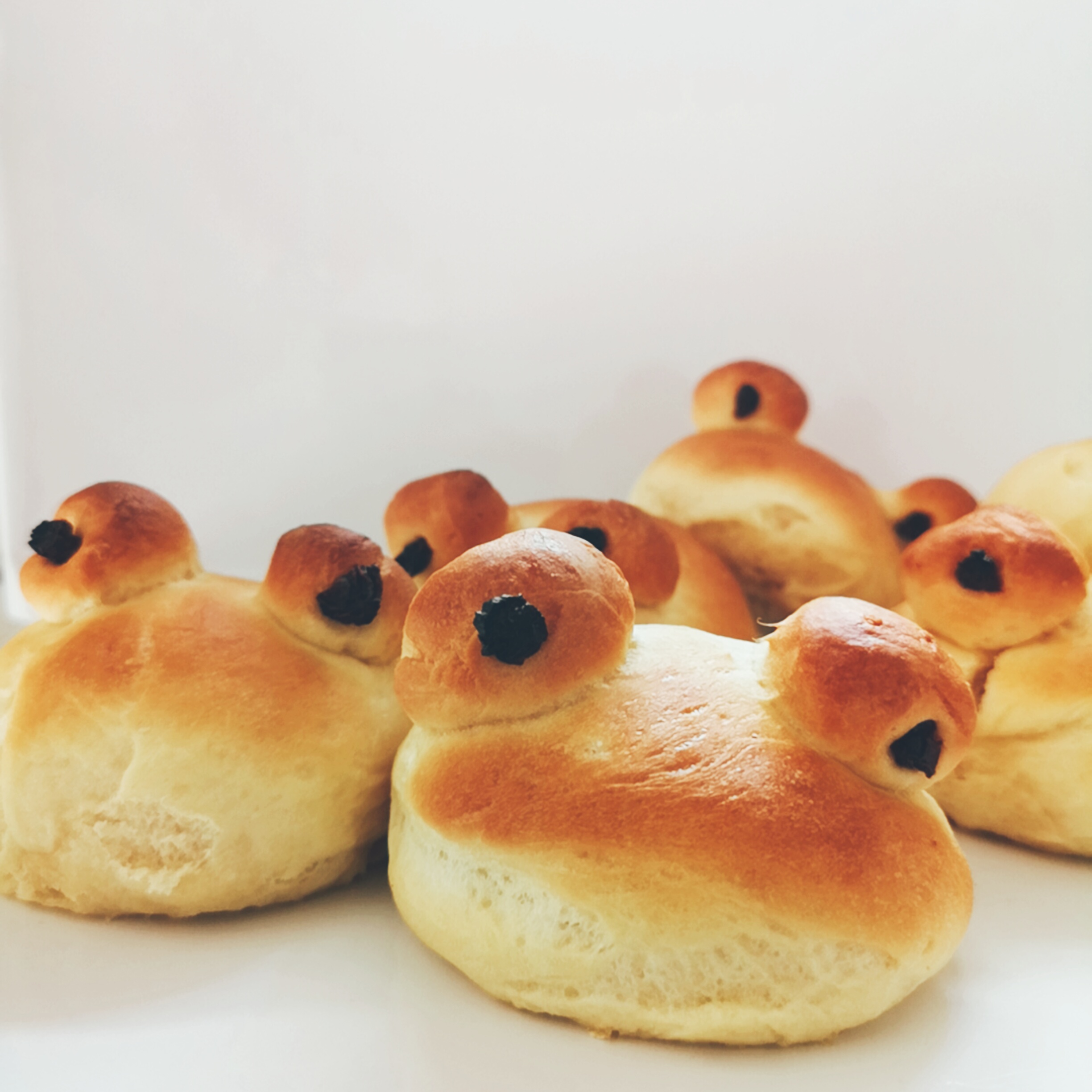 Os pães são muito simples de moldar. Só precisamos de abrir a massa, cortar com uma forma redonda maior o corpo, e com outra mais pequena os olhos. Colocar os olhos em cima e colocar as passas.