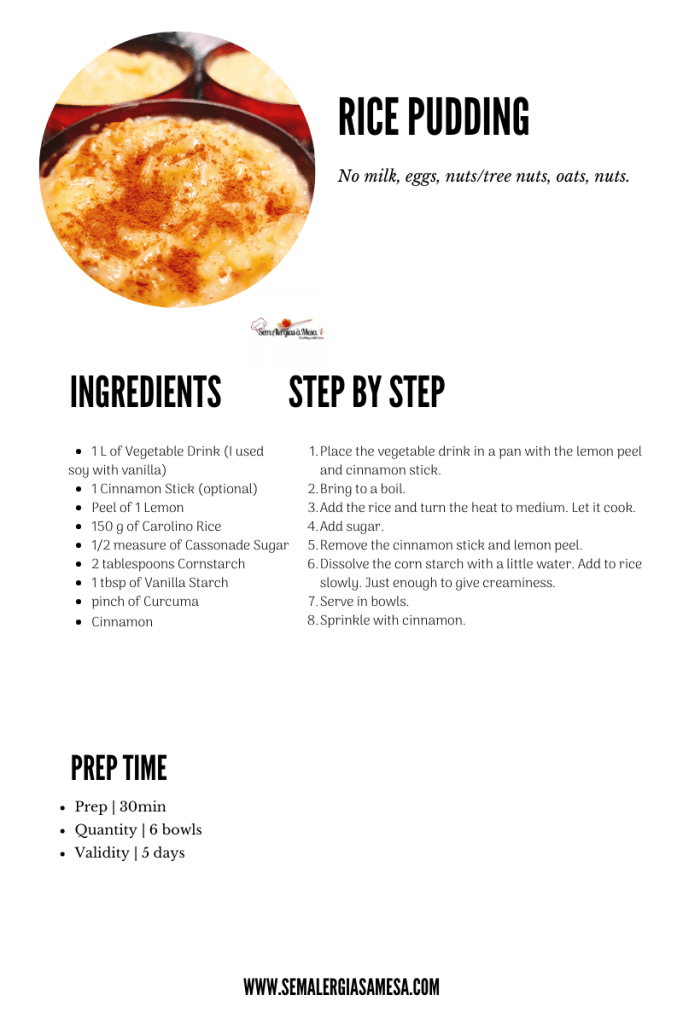 Milk – as only Renato and Lucas like rice pudding, I used a soy drink with vanilla that already has a yellow. But if they are allergic to soy, you can use any vegetable drink and add a spoonful of vanilla extract and for the yellow color a turmeric powder.