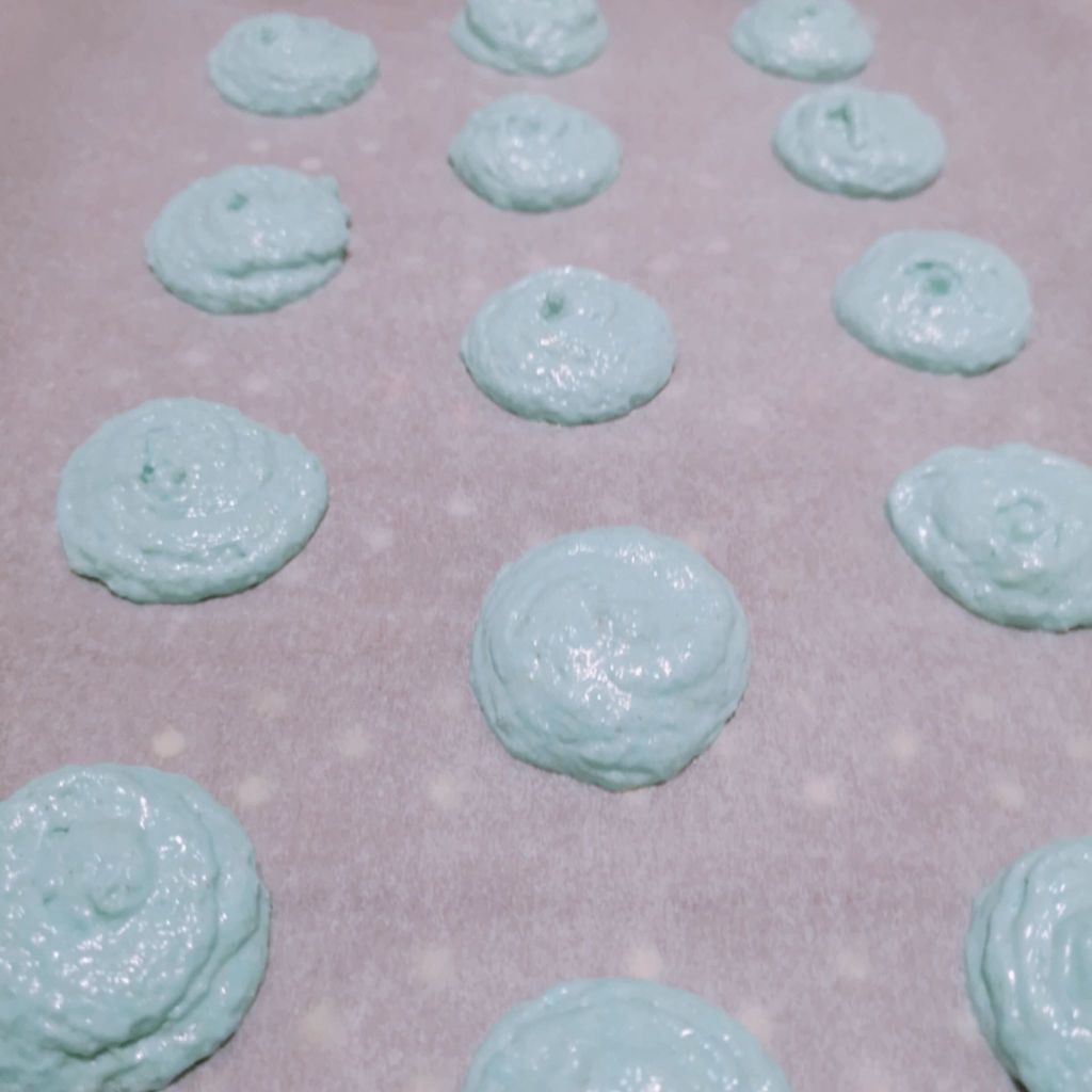 A massa coloca-se num saco de pastlereiro e fazem-se pequemos montes num tabuleiro forrado com papel vegetal/ silicone. Para que fiquem o mais crocante possível, depois de estarem no tabuleiro, bater 2/3 vezes com o tabuleiro na bancada e deixar 1 hora antes de meter no forno.