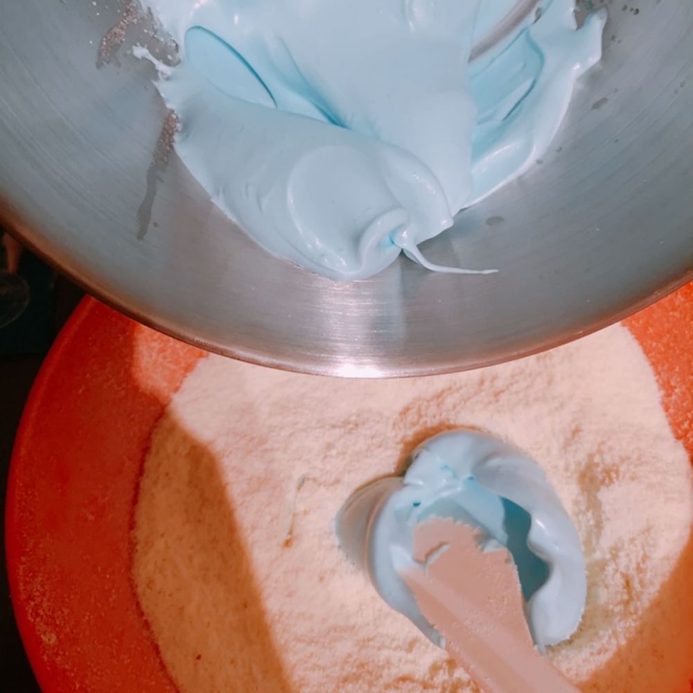 When the meringue is ready, gently sifted flour and powdered sugar are added. With a spatula, mix gently to avoid damaging the meringue. slow and steady movements towards the center of the bowl while turning with circular motion. At the end, the mixture should be shiny and when lifting the spoon we should see a thread.